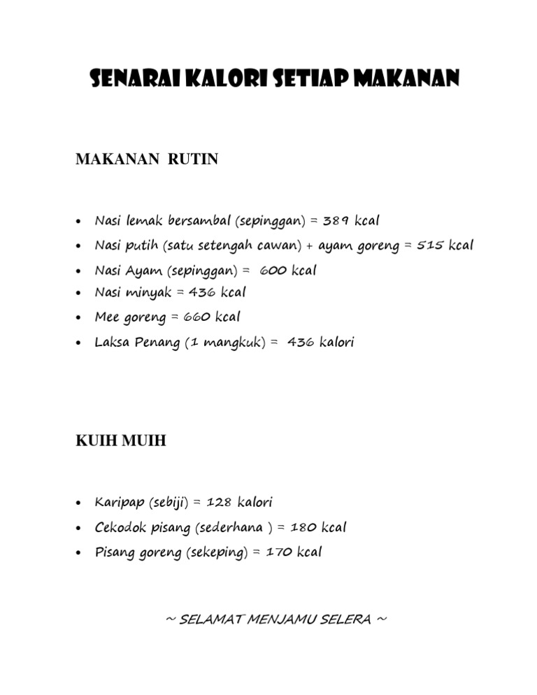 Nilai Kalori Makanan from imgv2-1-f.scribdassets.com Home » makanan » makanan sehat » 20 daftar makanan yang rendah kalori dan mengenyangkan. Dengan paduan nasi, ayam/daging/telur/udang dan minyak goreng, nasi goreng pun mempunyai nilai kalori yang tergolong tinggi. Melihat daftar kalori makanan bisa berguna karena dapat menyesuaikan asupan kalori dengan aktivitas yang dilakukan. Kalori pada makanan atau bahan makanan untuk menjaga kesehatan terkadang perlu kita perhatikan. Penambahan satu sendok makan margarin akan membuat kalori telur menjadi 262 kkal dan satu sendok makan minyak goreng menjadi 286,6 kkal per 100 gram telur. Kalau lagi diet, cek dulu sebelum santap. Malangnya, ramai yang tidak kisah dengan pengambilan diet kalori secara berlebihan ini. Makanan pedas ini memang sangat populer di indonesia.